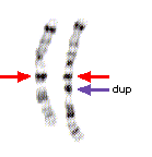 En la fotografia, las flechas rojas señalan bandas idénticas de cada cromosoma. La flecha azul señala una duplicación de la banda en la flecha roja. Se puede ver que el cromosoma en la derecha es más largo. La nomenclatura para esta anormalidad sería: